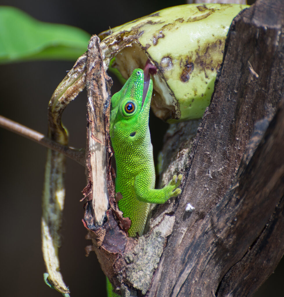 If you do want to take on a Giant Day Gecko as a pet, here’s the lowdown on their diet and foraging habits. They are omnivores with diverse appetites! In the wild, they consume insects, fruit, nectar, pollen, and flower sap. This varied diet makes them important participants in their ecosystem—they help control insect populations while also pollinating plants, as mentioned above.