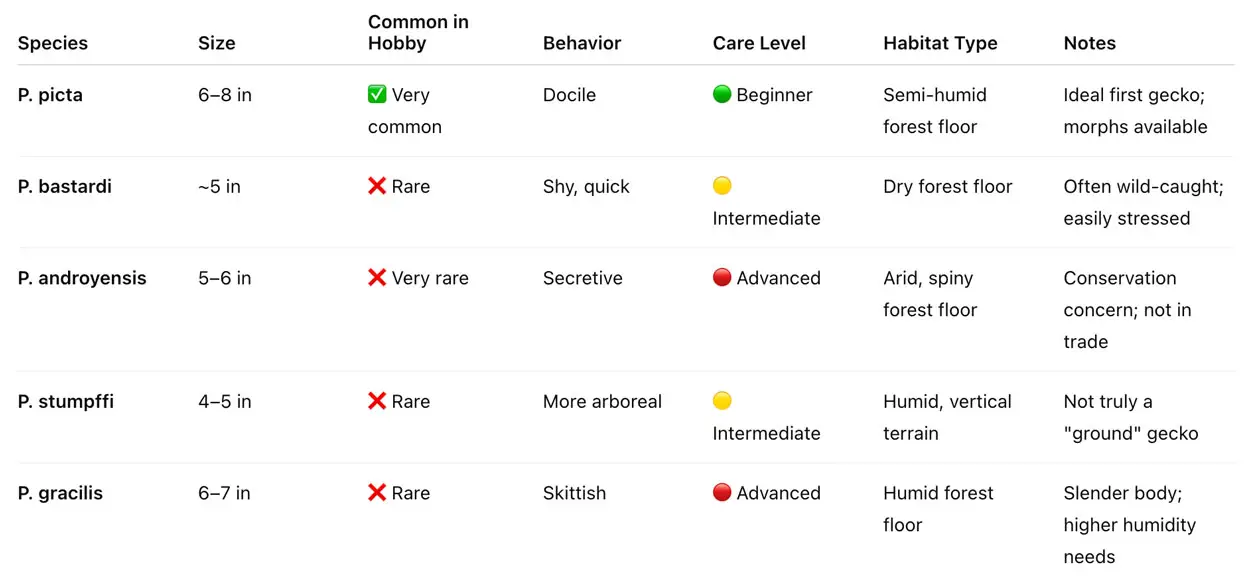 - Common Names: Madagascar Ground Gecko, Panther Gecko, Painted Ground Gecko